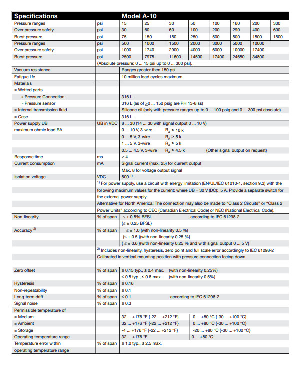 Spezifikationen Optional ist das Modell A-10 mit einer verbesserten Nichtlinearität erhältlich. Je nach gewählter Nichtlinearität ergeben sich folgende Werte:5 % der Spannweite Nichtlinearität ≤ ±0.25 % der Spannweite Nichtlinearität pro BFSL pro IEC 61298-2 Messbereich ≤ 0,1 bar [≤ 1,45 psi] ≤ ±0,5 % der Spannweite - Messbereich > 0,1 bar [> 1,45 psi] ≤ ±0,5 % der Spannweite ≤ ±0.25 % der Spannweite 1) Genauigkeit → Siehe. Messfehler pro IEC 61298-2 Max. Messfehler pro IEC 61298-2 Messbereich ≥ 0,6 bar [≥ 8,7 psi] ≤ ±1 % der Spannweite ≤ ±0,5 % der Spannweite Messbereich ≥ 0,4 bar [≥ 5,8 psi] ≤ ±1,2 % der Spannweite ≤ ±0.7 % Spannweite Messbereich ≥ 0,25 bar [≥ 3,6 psi] ≤ ±1,3 % Spannweite ≤ ±0,8 % Spannweite Messbereich ≥ 0,16 bar [≥ 2,3 psi] ≤ ±1,5 % Spannweite ≤ ±1 % Spannweite Messbereich ≥ 0,1 bar [≥ 1,45 psi] ≤ ±1.8 % Spannweite - Messbereich ≥ 0,05 bar [≥ 0,73 psi] ≤ ±2,4 % Spannweite - Nullpunktfehler 2) 3) 4... 20 mA / DC 1... 5 V / DC 0,5... 4,5 V / DC 0,5... 4,5 V ratiometrisch ≤ ±0,3 % Spannweite ≤ ±0.2 % der Spannweite DC 0 ... 10 V ≤ ±0,5 % Spannweite ≤ ±0,4 % Spannweite DC 0... 5 V 4) ≤ ±0,6 % Spannweite - 1) Nicht möglich mit Ausgangssignal DC 0... 5 V. 2) Messbereiche ≤ 0,1 bar [≤ 1.45 psi] (oder gleichwertig) nur bei ≤ ±0 möglich.5 % der Spannweite. 3) Außerhalb der Referenzbedingungen wird die Temperaturhysterese für Messbereiche < 0,6 bar [< 8,7 psi] hinzugefügt. 4) Nicht möglich bei Messbereichen ≤ 0,1 bar [≤ 1,45 psi] (oder gleichwertig).Bei gelegentlichen Störungen durch elektrostatische Entladungen, kann ein vorübergehender zusätzlicher Messfehler von bis zu ±2,5% auftreten.![]()