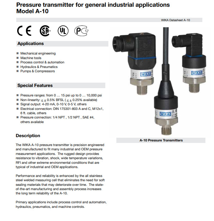 : Hochwertiger Drucktransmitter für allgemeine industrielle Anwendungen; Modell S-20; siehe Datenblatt PE 81.61 Druckmessgerät mit IO-Link; Modell A-1200; siehe Datenblatt PE 81.90 Datenblatt PE 81.60 ∙ 05/2023 Pressure transmitter For general industrial applications Model A-10 Description The field-proven model A-10 pressure transmitter (pressure sensor) is the all-rounder for pressure measurement in industrial environmentsDie Kompakte Bauweise ermöglicht die Integration in eine Vielzahl von Maschinenkonstruktionen.Ausgezeichnete Qualität und bewährte Technologie Unsere langjährige Erfahrung und genaue Kenntnis der Kundenbedürfnisse wurden in die Entwicklung des Modells A-10 integriertEs hat sich seit über zehn Jahren in unzähligen Anwendungen bewährt.Die gleichbleibend hohe Qualität und die zuverlässige Funktionsweise werden weltweit geschätzt und regelmäßig durch interne und externe Audits bestätigt.Dieser Bestseller kann bis zu 100 Millionen Belastungszyklen mit fast konstanter Präzision ertragen.Modell A-10 Messungen Anwendungen ■ Maschinenbau ■ Mess- und Steuerungstechnik ■ Hydraulik und Pneumatik ■ Pumpen und Kompressoren ■ Schiffbau